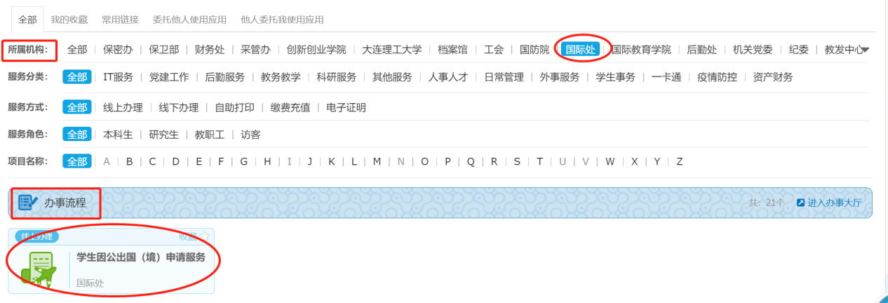3、“Organization”find“International Office”,“Business Procedure”click“Short-term Business Trip Application Service for students”