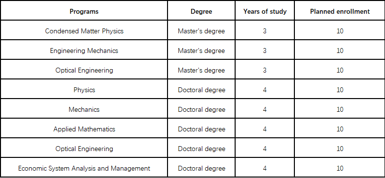 Three master’s joint training programs are Condensed Matter Physics, Engineering Mechanics, and Optical Engineering; five doctoral joint training programs are Physics, Mechanics, Applied Mathematics, Optical Engineering, and Economic System Analysis and Management.