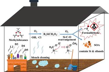 With stricter regulation of atmospheric volatile organic compounds (VOCs) originating from fossil fuel-based vehicles and industries, the use of volatile chemical products (VCPs) and the transformation mechanism of VCPs have become increasingly important to quantify air quality. Volatile methylsiloxanes (VMS) are an important class of VCPs and high-production chemicals. Using quantum chemical calculations and kinetics modeling, the team investigated the reaction mechanism of peroxy radicals of VMS, which are key intermediates in determining the atmospheric chemistry of VMS. L2-RSiCH2O2• and D3-RSiCH2O2• derived from hexamethyldisiloxane and hexamethylcyclotrisiloxane, respectively, were selected as representative model systems. The results indicated that L2-RSiCH2O2• and D3-RSiCH2O2• follow a novel Si–C–O rearrangement-driven autoxidation mechanism, leading to the formation of low volatile silanols and unexpected high yield of formaldehyde at low NO/HO2• conditions. At high NO/HO2• conditions, L2-RSiCH2O2• and D3-RSiCH2O2• react with NO/HO2• to form organic nitrate, hydroperoxide, and active alkoxy radicals. The alkoxy radicals further follow a Si–C–O rearrangement step to finally form formate esters. The novel Si–C–O rearrangement mechanism of both peroxy and alkoxy radicals are supported by available experimental studies on the oxidation of VMS. Notably, the high yield of formaldehyde is estimated to significantly contribute to formaldehyde pollution in the indoor environment, especially during indoor cleaning.