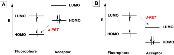 In thisaccount, Peng’s team highlight the recent advances of rational design and applications of PET probes, focusing primarily on studies from our research group. For example, different from the case of the traditional single-atom electron donor (O, S, N, Se, Te, etc.) in typical PET,they used a electron-rich pyrrole ring to “switch off” the fluorescence of the fluorophore more efficiently through an “enhanced PET” effect which provided a lower background fluorescence and higher signal-to-noise ratio. Furthermore, normal PET represents the main principle behind the design of small molecule “off–on” fluorescent sensors.Theydeveloped new PET platform through intramolecular space folding (folding PET) to overcome the difficulty of designing PET enzyme-targeting probes. Therefore, based on typical PET and these new PET concepts,they, for instance, reported PET probes for the detection of Zn2+without proton interference, a BODIPY-based d-PET probe for reporting local hydrophilicity within lysosomes, and an “enhanced PET” fluorescent probe for imaging HClO in cancer cells.They also developed COX-2-specific probe for identifying cancer cells and quantifying cancer-related events, and a KIAA1363-sensitive probe for tracking solid tumors in living mice. Furthermore,they first applied an aminopeptidase N (APN)-sensitive probe based on PET for cancer diagnosis and therapy.They anticipate that further development of PET fluorescent probes providing more sensitivity and selectivity to analytes of interest will be equipped with more functions and play indispensable roles in the studies of pathology, diagnostics, and cancer therapies.