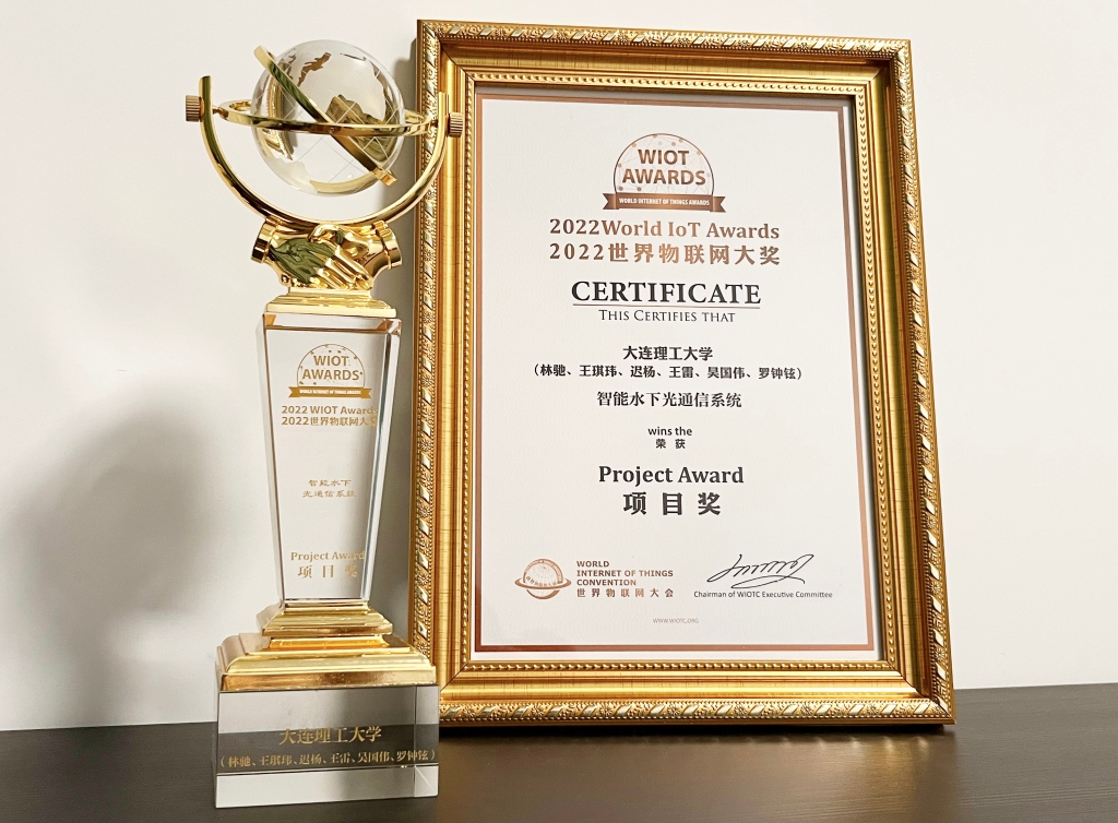 Recently, the 7th World Internet of Things Convention (WIOTC) was held in Beijing. United Nations Secretary-General Guterres made the speech for the Convention. Leaders, ambassadors, counselors, experts, academicians, enterprises, and representatives of media from more than 100 countries and regions attended the Convention online and offline. Nearly thirty-three million people watched the live stream. The “Intelligent Underwater Optical Communication System” project of DUT School of Software won the 2022 World IoT Innovation Project Award, becoming the only award-winning project of domestic universities.