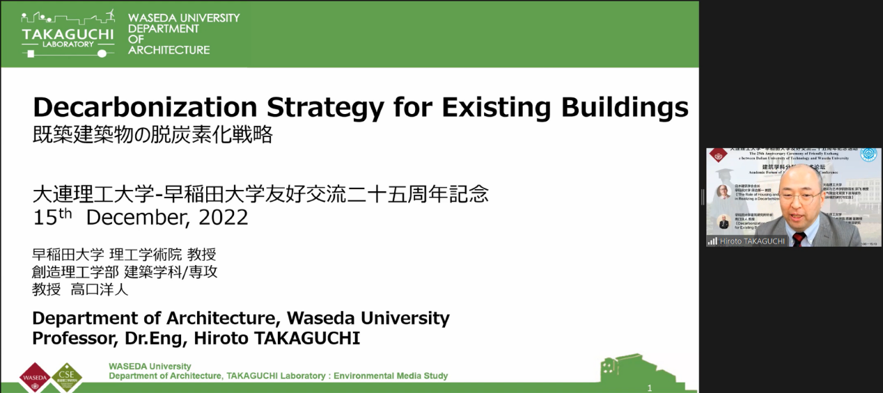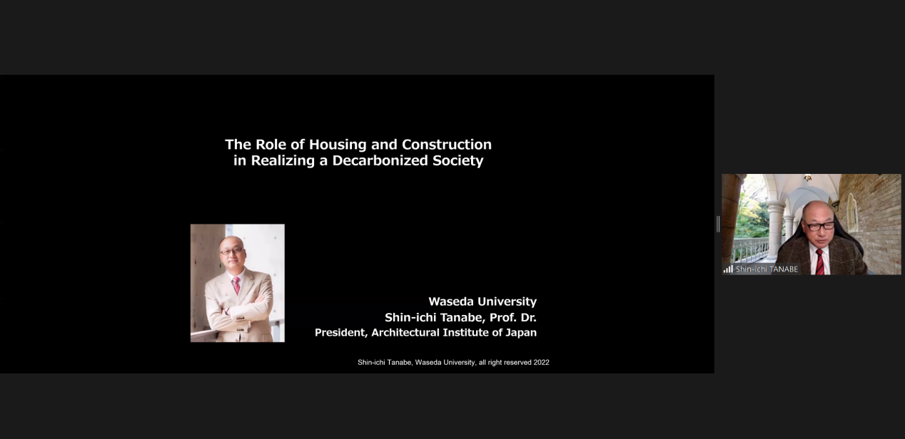 会议的第二个阶段为学术论坛。首先,由日本建筑学会会长、日本科学委员会委员、早稻田大学田边新一教授进行主题为《The Role of Housing and Construction in Realizing a Decarbonized Society》的报告。在日本到2050 年实现碳中和的目标,住房和建筑的碳排放量约占日本总量40%的背景下。田边新一教授报告中展示了建筑在碳中和领域的巨大作用,还解说了ZEB、ZEH的实例和建筑材料、施工时的减排。两校师生们就碳中和及建筑发展趋势展开热烈讨论,探讨未来建筑设计减碳方式的可能性。