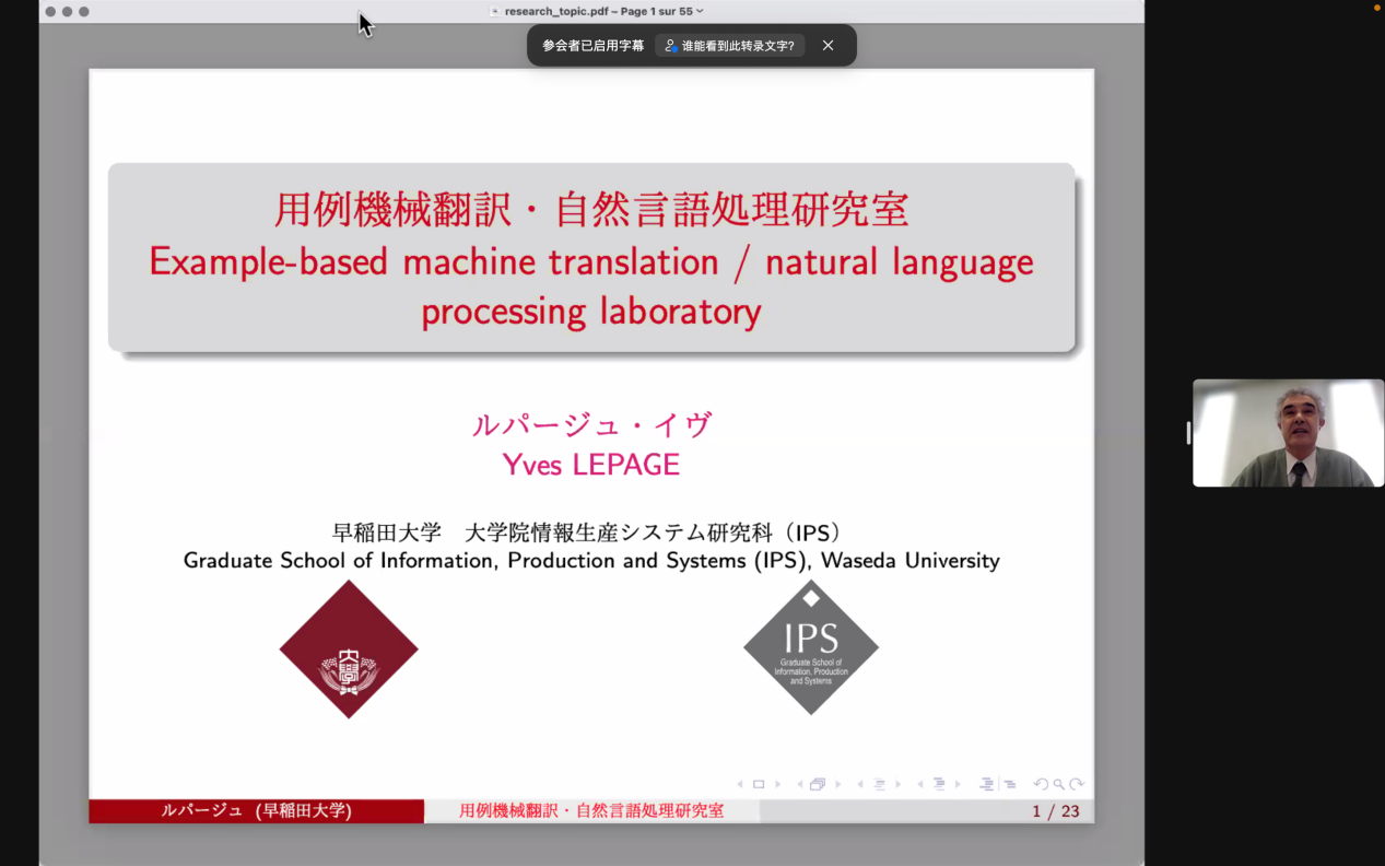 早稻田大学信息生产系统研究科YvesLepage教授做了基于示例的机器翻译/自然语言处理实验的学术报告。YvesLepage教授的团队目前专注于研究类比及其在自然语言处理(NLP)中的数据扩充,特别是在机器翻译中的应用。