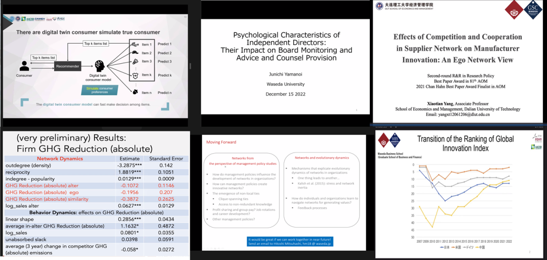此次论坛邀请早稻田大学商学部Hitoshi Mitsuhashi教授、Shigeru Asaba教授、Joel Baker Malen副教授、Junichi Yamanoi副教授与大连理工大学经济管理学院李先能教授、杨筱恬副教授围绕创新网络、绿色创新战略、公司治理、大数据研究等领域进行了报告分享,大连理工大学经济管理学院、早稻田大学商学部数十位师生共同进行了线上学术交流及研讨。