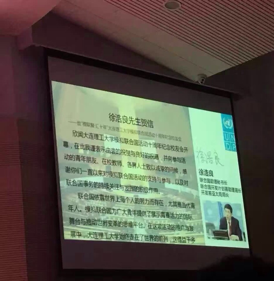 徐浩良先生在信中首先表达了对大会的由衷祝贺和良好祝愿,并感谢活动参与者对联合国事务的持续关注与发挥的积极极用。同时,他提到“联合国依靠世界上每个人的努力而存在,尤其是当代青年人,模拟联合国为广大青年提供了展示青春活力的国际舞台与推动世界变革的思维平台”,徐浩良先生充分肯定了大连理工大学在模拟联合国活动的推广与发展中做出的突出贡献。最后,他期待各位参与过模联的青年同学通过努力最终可以来到联合国工作,为自己的祖国代言,为整个世界作出贡献。
