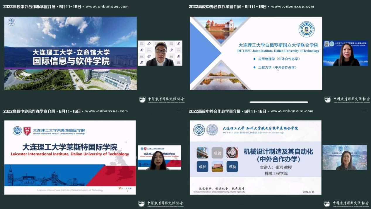 6月11日,由中国教育国际交流协会主办的“2022高校中外合作办学宣介展”于线上拉开帷幕,国内近百家高水平中外合作办学机构和项目共话新时代中外合作办学发展。大连理工大学-立命馆大学国际信息与软件学院、大连理工大学白俄罗斯国立大学联合学院、大连理工大学莱斯特国际学院等三个中外合作办学机构以及大连理工大学-加州大学欧文分校合作办学项目与全国考生、家长相约“云端”,在线提供“优选优学”升学指导。