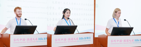 加州大学欧文分校学生代表Tyler Joseph Krudwig、大连理工大学学生代表蒋其芮、圣彼得堡彼得大帝理工大学的带队教师代表Aleksandra Nechai在开营仪式上发言。