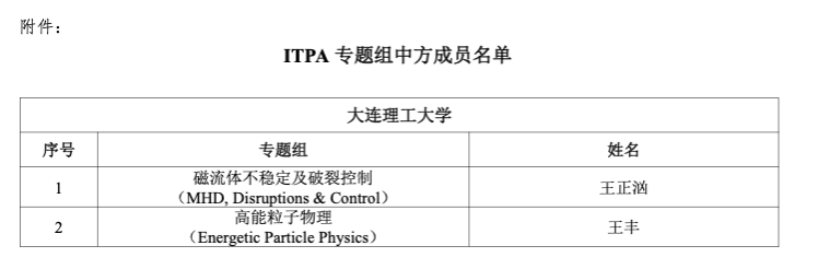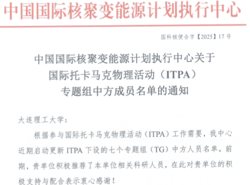 近日,中国国际核聚变能源计划执行中心正式印发《关于国际托卡马克物理活动 (ITPA) 专题组中方成员名单的通知》(国科核便合字【2025】17 号),公布了国际托卡马克物理活动(ITPA)下设七个专题组(TG)的中方成员名单及联系人。大连理工大学科研人员成功入选相关专题组。