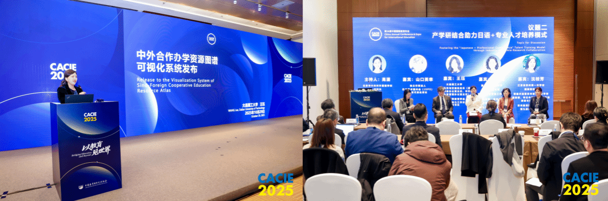会议期间,我校代表在中外合作办学高质量发展专题研讨会上发布《中外合作办学资源图谱可视化系统研究》,该研究运用可视化技术,构建开放共享的资源导航平台,精准呈现合作院校间的资源分布与关联,为优化合作办学资源配置提供了创新解决方案;在“数字化背景下日语+专业人才培养探究新范式”圆桌论坛,基于我校中日合作办学与理工科日语强化班的实践,分享“日语+专业”复合型人才培养的探索经验,探讨数字化时代人才培养的新路径。