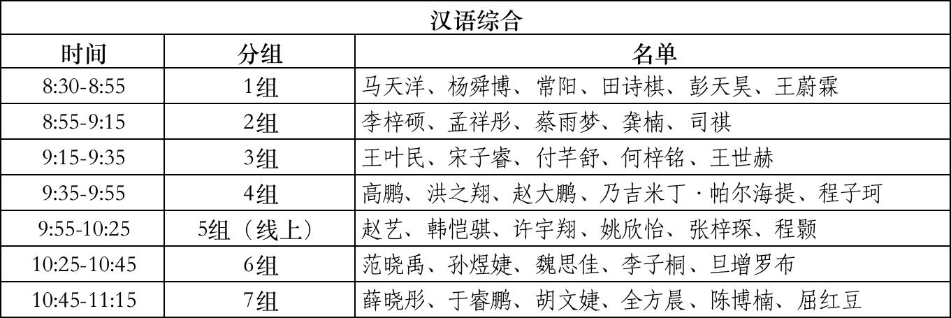 汉语综合面试:自我介绍(1分钟/人)、评委问答