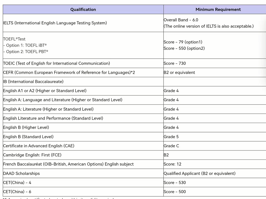 或其他国际英语英语考试结果也被认可,参考以下认证标准: