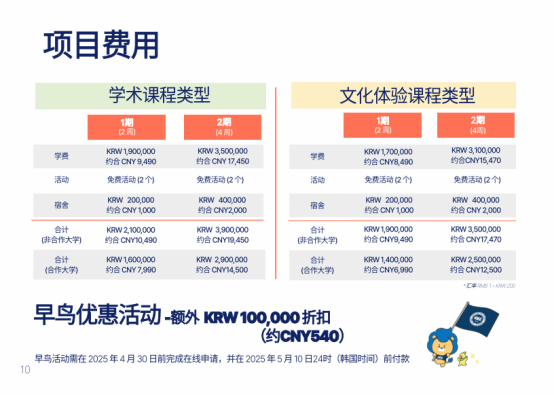注:在指定日前完成在线申请和付款可享100000韩元折扣。