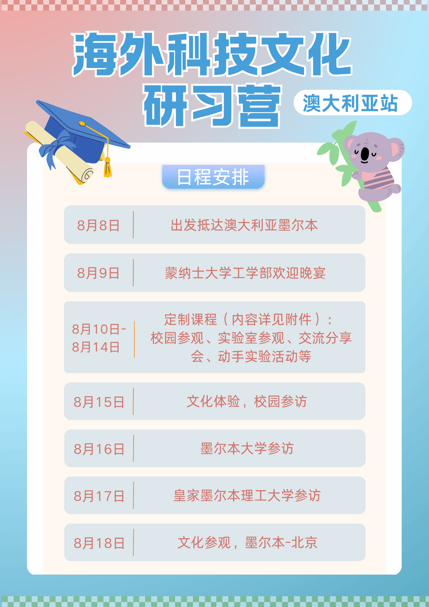 为进一步提升我校学子的国际化视野,丰富大家到世界顶尖大学学习研修的经历,我校拟于2026年暑假期间组队出访澳大利亚名校学习。