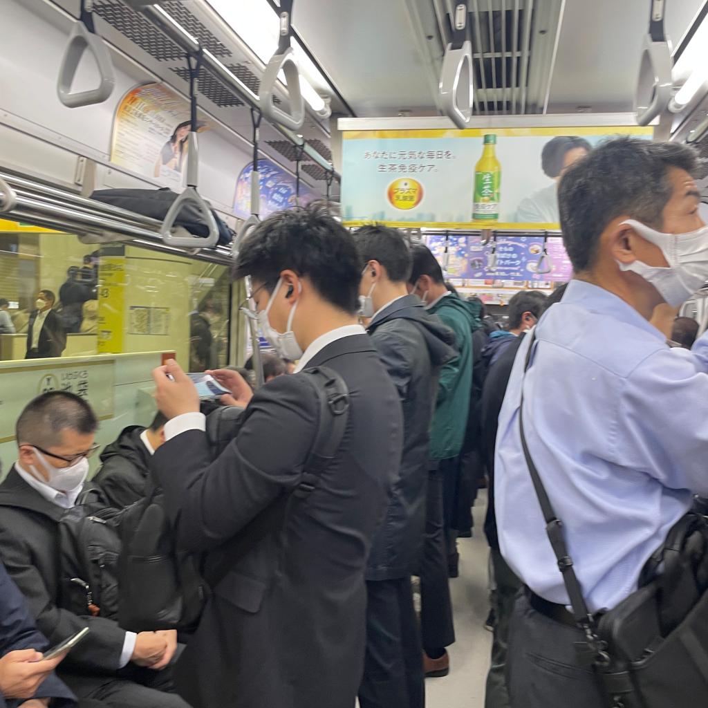 工作日,电车内满满当当的一厢厢深色西装的上班族。待久了会觉得气氛压抑。