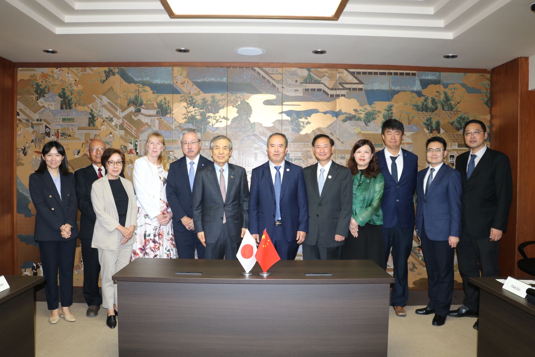 立命館大学を訪れた際、代表団は中谷善雄学長と会談を行いました。双方は、健康医療知能計算の共同研究センターの設立、各分野にわたる科学研究協力の強化、革新的な人材の共同育成などについて合意に達しました。会談の前に代表団は大阪茨木にある立命館大学の新しいキャンパスを見学しました。